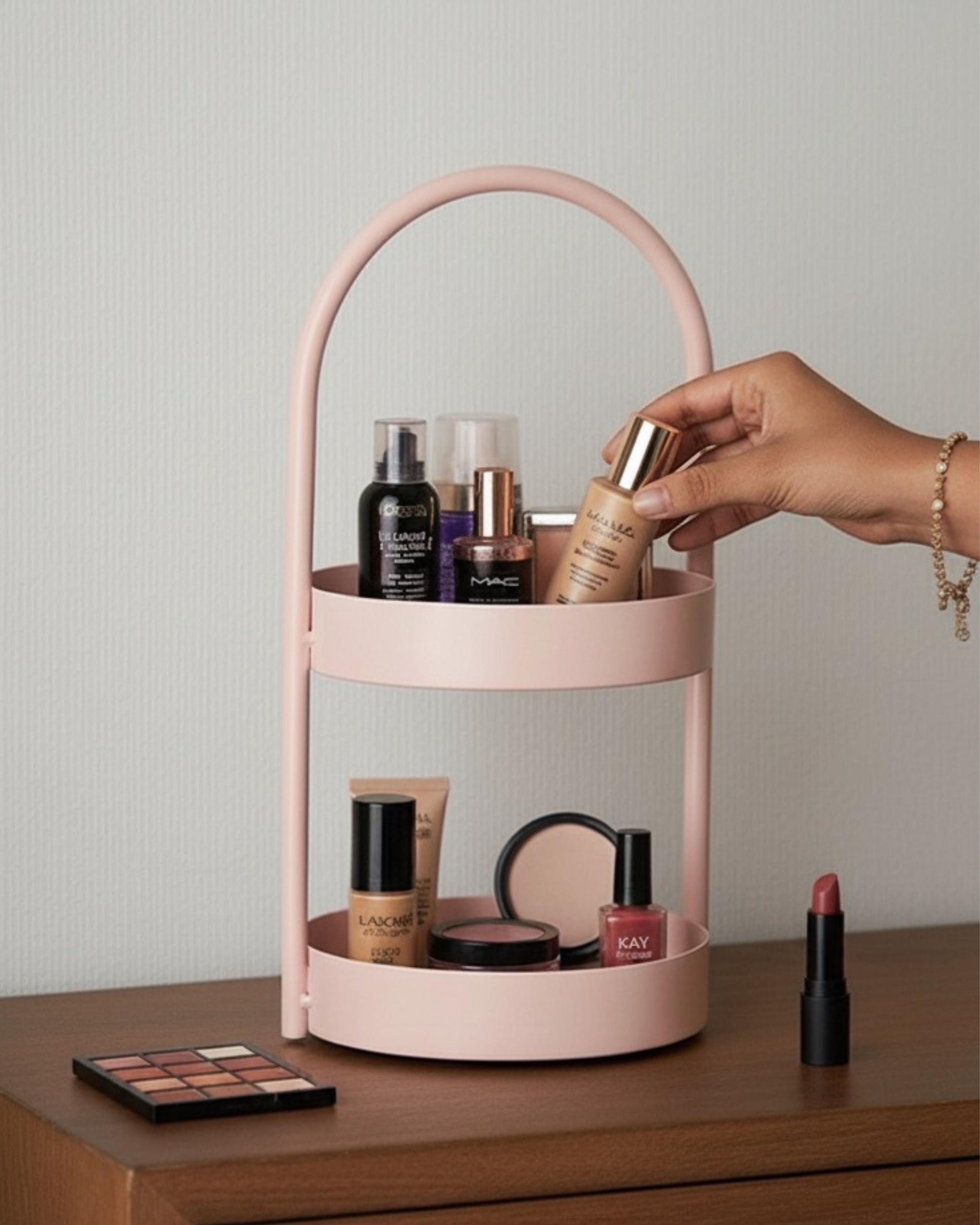 - 📚 Two-Tier Elegance: Stylish pink metal trays for makeup, skincare, or more.